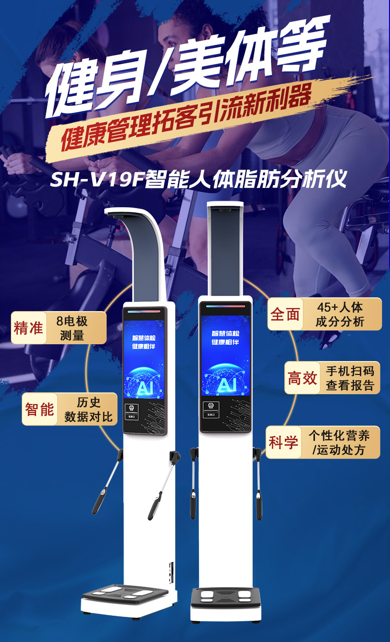 上禾科技,作為一家專注于健康一體機生產的廠家,其生產的人體成分分析儀在市場上備受矚目。其中,SH-V19F型號的人體成分分析儀更是以其高精度、多功能和人性化的設計贏得了廣泛好評。這款設備采用8電極測量,通過BIA法測量人體電阻抗值來評估人體成分,可測量的指標包括但不限于總水分、蛋白質、無機鹽、體脂肪量、體重、肌肉量、骨骼肌肉量、身體質量指數(BMI)、體脂肪率、腰臀比等。此外,人體脂肪分析儀外觀設計符合人體工程學,使用體驗極佳。